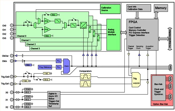 所有的Spectrum采集卡基于完全的同步设计。每个通道都有自己的独立的输入放大器以及一个独立的ADC,允许程序对所有的输入通道的进行独立的设置。