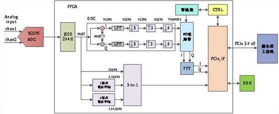 JESD204B: FPGA内部JESD204B接口模块,用于对ADC传输到FPGA的5GSPS实信号的接收处理,恢复出实信号。
