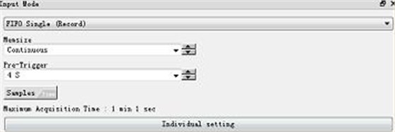 针对用户产生的窄脉冲信号特征,信号幅度0-2Vpp,可以选取采集卡的前置放大器范围2.5V,窄脉冲的重复频率是1kHz,这样脉冲信号都是burst模式出现的。采集卡可以选择通道触发,设置某一个阈值,当达到这个阈值,就开始采集,这样保证采集到的数据都是有效的脉冲数据。用户可以针对采集到的脉冲数据,去除大量无用型号和噪声信号。