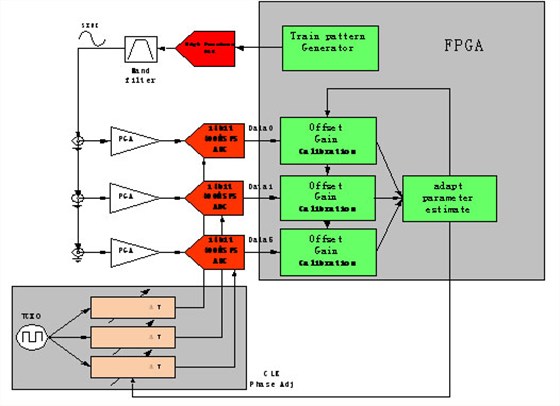 校正功能有校正电路和FPGA算法部分组成,校正电路由高精度低速DAC,参考源,滤波器和时钟相位微调芯片组成。FPGA算法核心为参数估计自适应算法和校正参数逻辑组成。校正目标为设置一个基准通道,其他5个通道的时钟相位以及gain和offset向该基准通道标定。该方法不能校准每通道ADC的绝对精度,而只是每通道的个参数一致,这对测量每通道采集数据的相对相位是足够了!