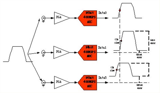 6个通道的采集误差主要由模拟电路以及不同ADC芯片的clkslew,gainerror以及offseterror组成。尽管我们在设计硬件电路以及PCB设计会尽量考虑以上问题,如同源的时钟分布以及相同的走线;6个ADC公用精准的外部参考电压源等等,但不幸的是,这些设计改进并不能完全消除这些由模拟器件本身的固有特性引起的误差,这些误差是随机的,也随温度变化而变化的。