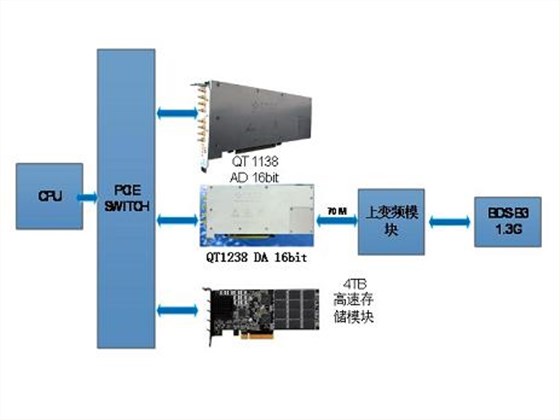 采集系统由工控计算机、模数AD转换系统QT1138,数模DA转换系统QT1238、SSD存储器,上变频等模块组成;各个模块集成在一台工控机箱中。其集成工作原理见下图: