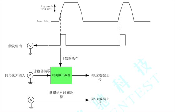 绝对时间记录模式:触发脉冲输出到GPS绝对时间计数器中;当绝对时间计数器检测到上升沿,锁定绝对时间计数器,然后通过总线形式读取当前时间,同ADC采集数据上传主机。