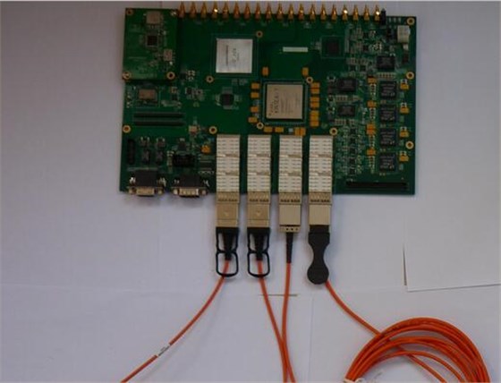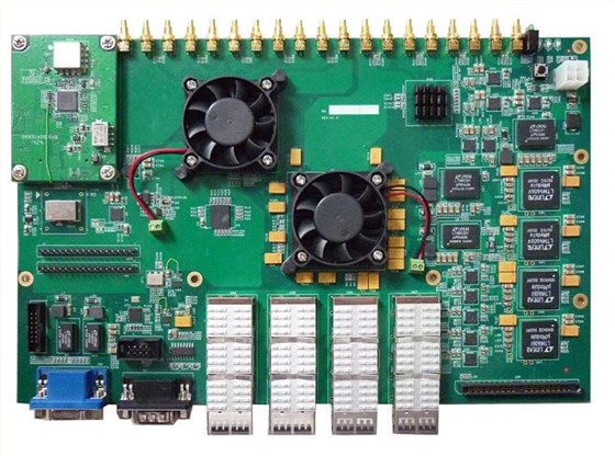基于光纤接口的超带宽MIMO通信测试系统可以完成4路宽带信号收发(两对IQ信号)测试,并进行基于FPGA的实时数据处理的目的。其中AD通道采样率为10bit,1.25GS/s, DA通道为14bit, 1.5GS/s。