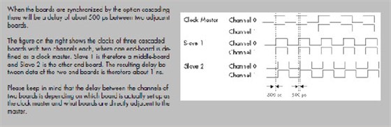 选取一张卡作为Master,另外一张卡作为Slave,这样组成统一的系统,保证8个通道的同时输出数据。