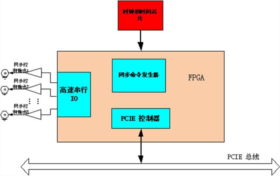 主控同步模块通过PCIE总线接收主控软件的控制命令,通过板载的FPGA控制时钟芯片和自身硬件逻辑,向各个同步接收卡发送同步和时间命令。通信协议由系统事先制定好,为了远距离传输命令,控制接口采用高速串行接口连接。