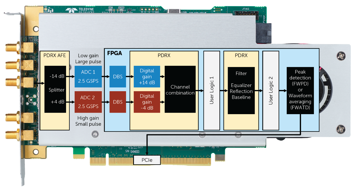 附加板载FPGA实时数字信号处理,包括:数字基线稳定器(DBS),用于精确的温度补偿基线,作为确定峰值高度的稳定参考。脉冲检测固件(FWPD)用于数据压缩为FPGA中的峰值列表。先进的时域固件(FWATD),用于在FPGA中通过阈值和平均波形来抑制噪声。