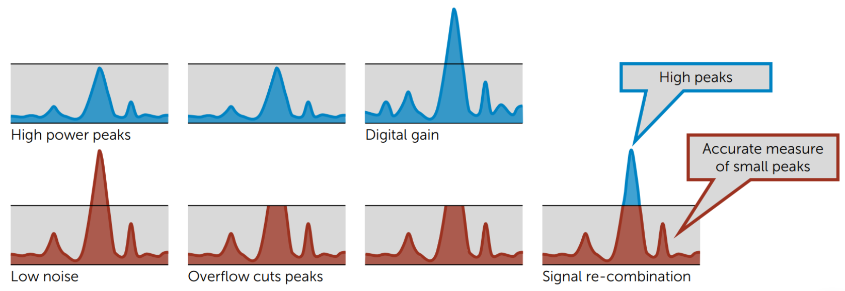 ADQ32-PDRX是一款高速数字化仪,具有扩展的脉冲数据动态范围应用和微弱信号采集的应用。微弱信号的获取质量由底层数据采集系统可达到的动态范围决定,而市售的模数转换器(adc)对此有瓶颈。具有DC耦合前端工作速度为每秒2Gsample (GSPS)的全带宽ADC通常提供大约9位有效位数(ENOB)。本文提出的脉冲检测范围扩展(PDRX)方法有助于将动态范围提高3位。 一种行之有效的方法是通过具有不同增益设置的两个通道获取输入信号。高增益通道用于放大和捕获输入信号的低幅值部分,而低增益通道用于捕获满 量程输入信号而不引起饱和。然后在板载FPGA内部应用数字增益,并将改进后的ENOB组合后输出。